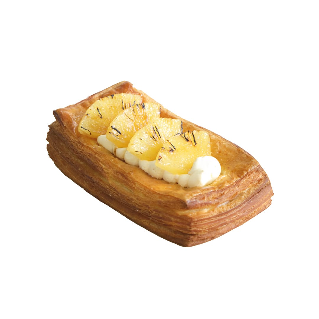 A golden flaky Danish topped with juicy pineapple, offering a refreshing balance of sweetness and tropical flavour.